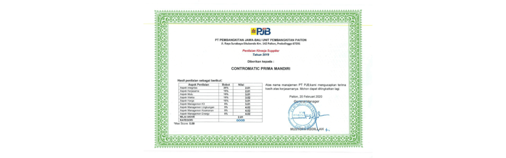 Results of the supplier performance evaluation of PT. Java – Bali Generation Unit Paiton 2019 Generation Unit, awarded to PT. Contromatic Prima Mandiri.