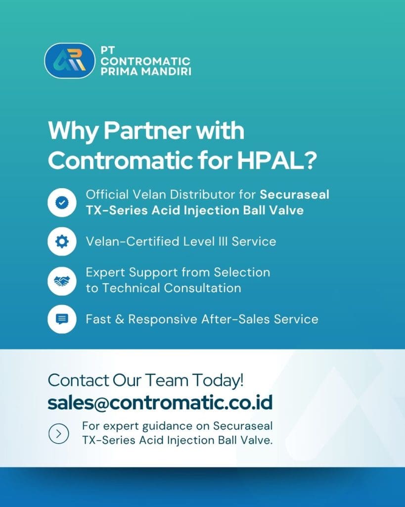As the official Velan distributor in Indonesia, Contromatic stands at the forefront of delivering reliable and high-performance valve solutions for the mineral mining industry. The Velan Securaseal TX-Series Acid Injection Ball Valve is specifically engineered to withstand HPAL’s most severe operating environments, ensuring long-term performance and safety through: